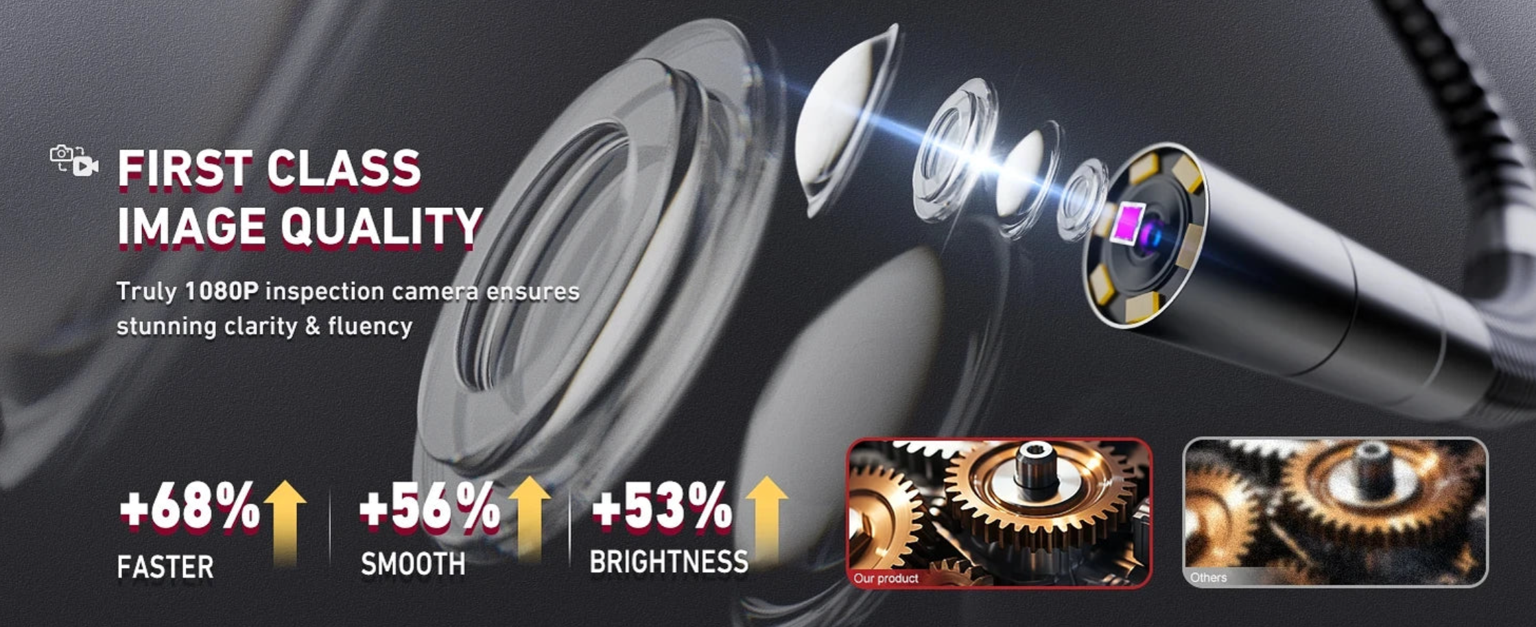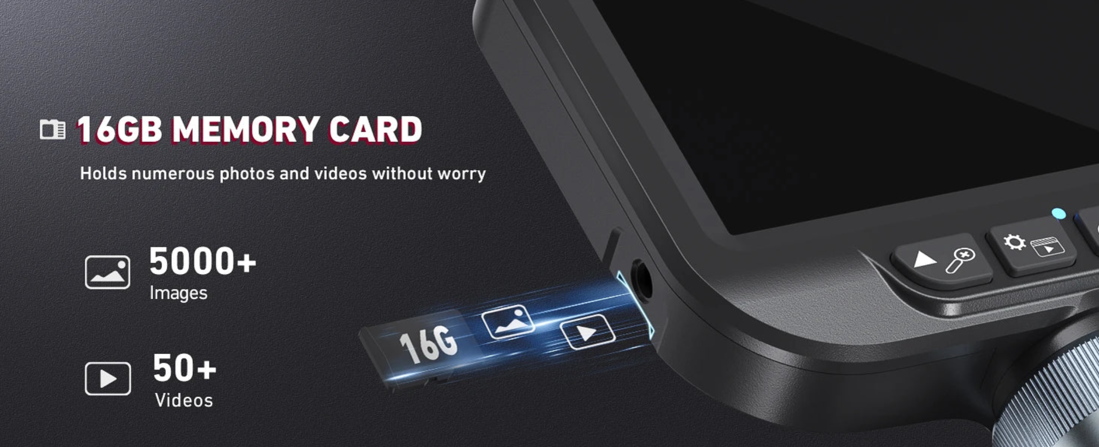 The camera probe is both water and oil-proof and has built-in led lighting with adjustable intensity. A temperature sensor warns you if the probe temperature is too high.