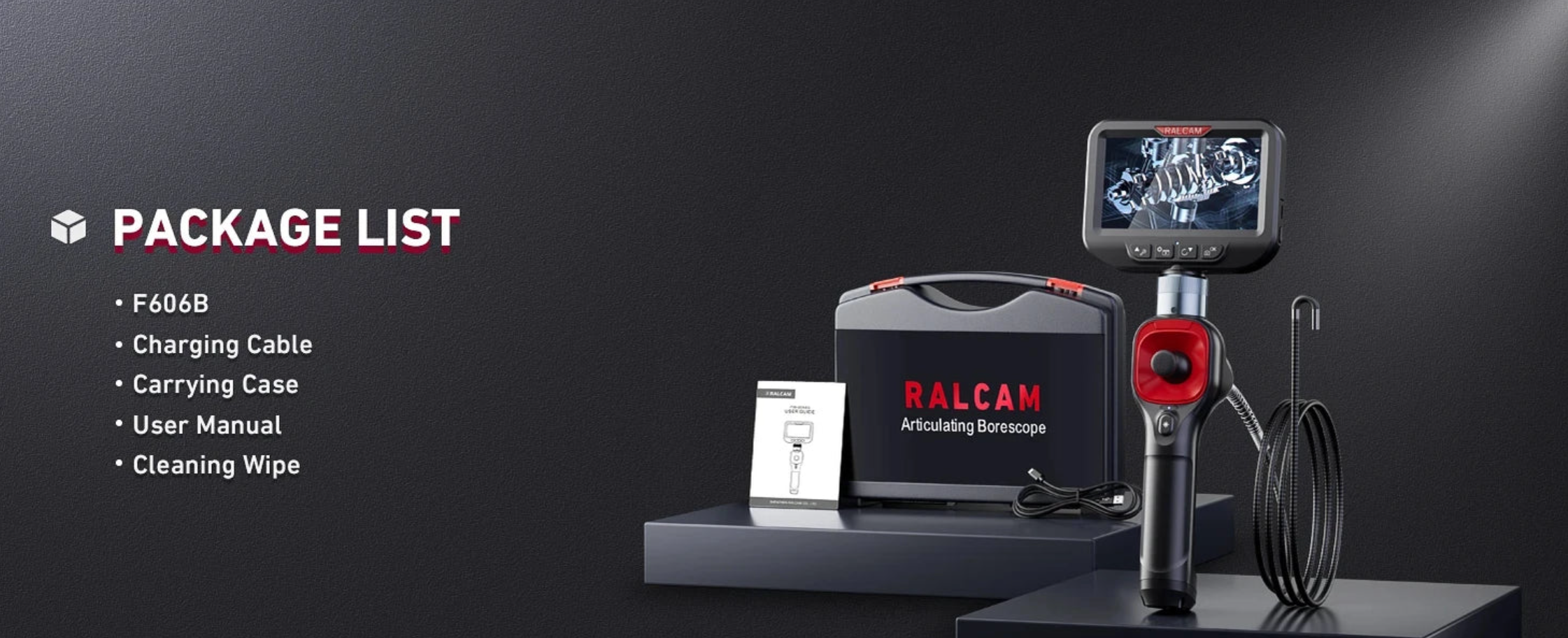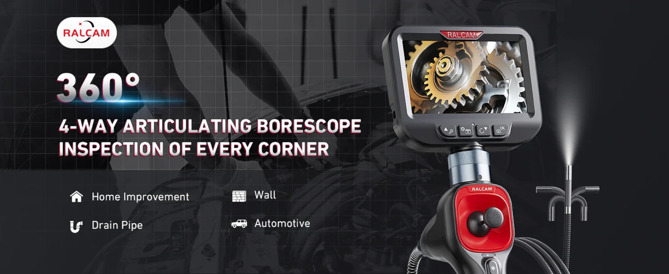 The Ralcam F6B Articulating Borescope with a built-in display is designed for professional use in automotive, industrial, and HVAC applications. It offers a range of features that make it a versatile tool for inspecting hard-to-reach areas, including engine compartments, HVAC ducts, and more.