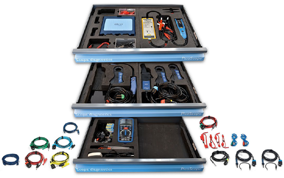 The EV Accessories are available separately so that those with PicoScope Kits can add EV capabilities. Guided tests and videos are already available and more are on the way. The key elements of the kit are three high-current clamps, a 2-pole voltage tester, PC-linked insulation tester, and a high-voltage differential probe. Please note that the insulation tester is higher than the foam trays, and therefore a deeper drawer will be required for that tray.