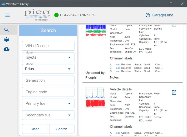 You can upload your waveforms to this library and optionally share them with other PicoScope users. Thousands of users contribute, and there are over 11,000 waveforms in categories for easy searching available as at the time of writing.